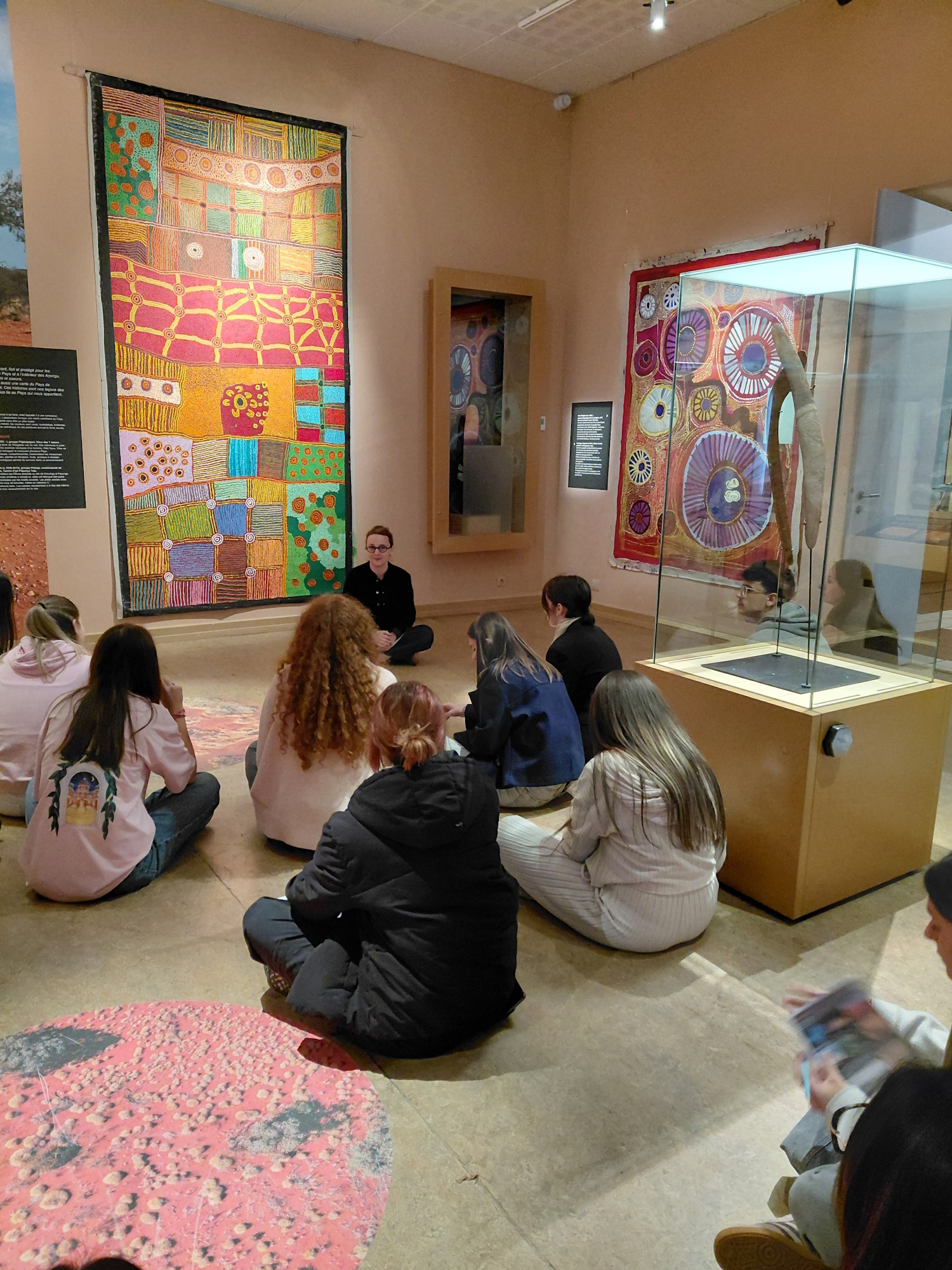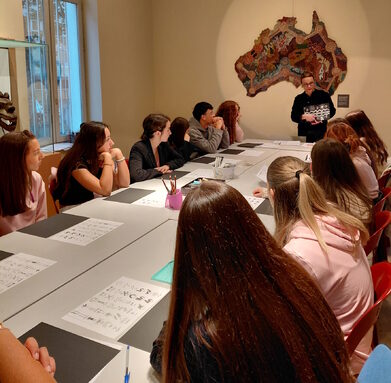 Le terrain avait été bien préparé en cours d’Anglais/ETLV sur cette civilisation, la plus ancienne au monde, mais la surprise fut grande pour tous de découvrir les spécificités de l’art aborigène sur toile ou sur écorce d’eucalyptus, les subtilités du didgeridoo ou autres objets traditionnels du bush australien, la totémisation et le symbolisme aborigène, grâce au guidage éclairé et interactif de Mme Thierre, Directrice du Musée.