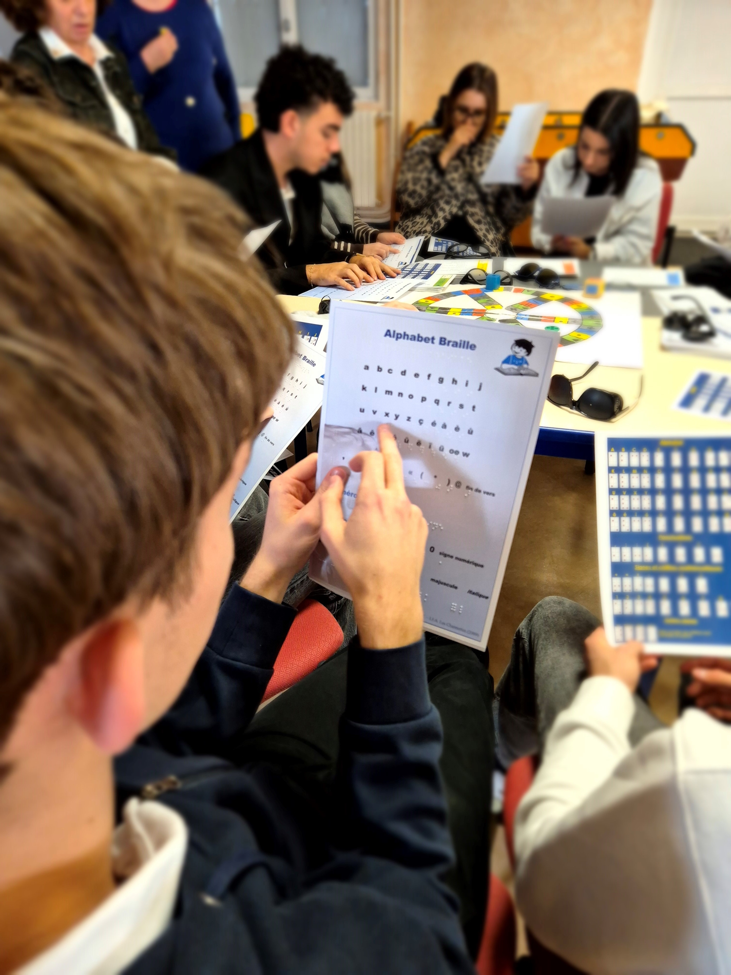 Les étudiants ont découvert l'accompagnement mené auprès d'un public en situation de déficience visuelle et de non voyance, lors d'un temps de présentation interactif animé par une orthoptiste spécialisée en basse vision et de mises en situation immersives : port de bandeaux occultants, utilisation de lunettes de simulation de pathologies visuelles, manipulation de jeux adaptés, initiation au braille et découverte des outils numériques spécifiques. Ces expériences concrètes leur ont permis de mieux saisir les réalités du handicap visuel et les enjeux de l'accompagnement.